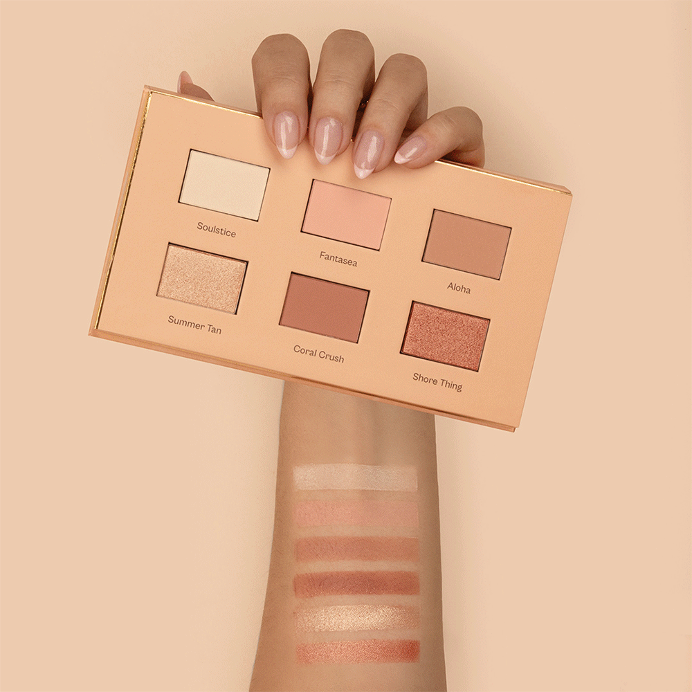 Have the softest gaze in the room with the delicate shades of TOUJOURS Peach Palette: Soulstice, Fantasea, Aloha, Summer Tan, Coral Crush, and Shore Thing.